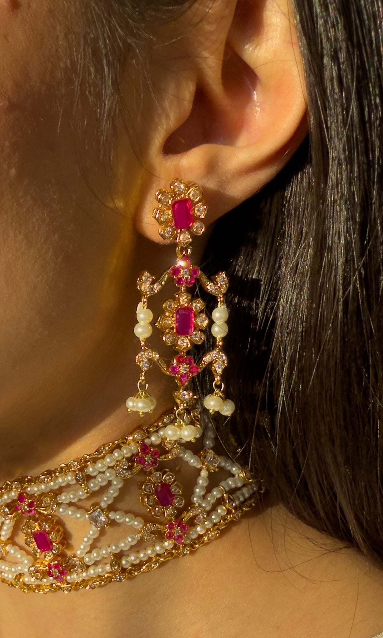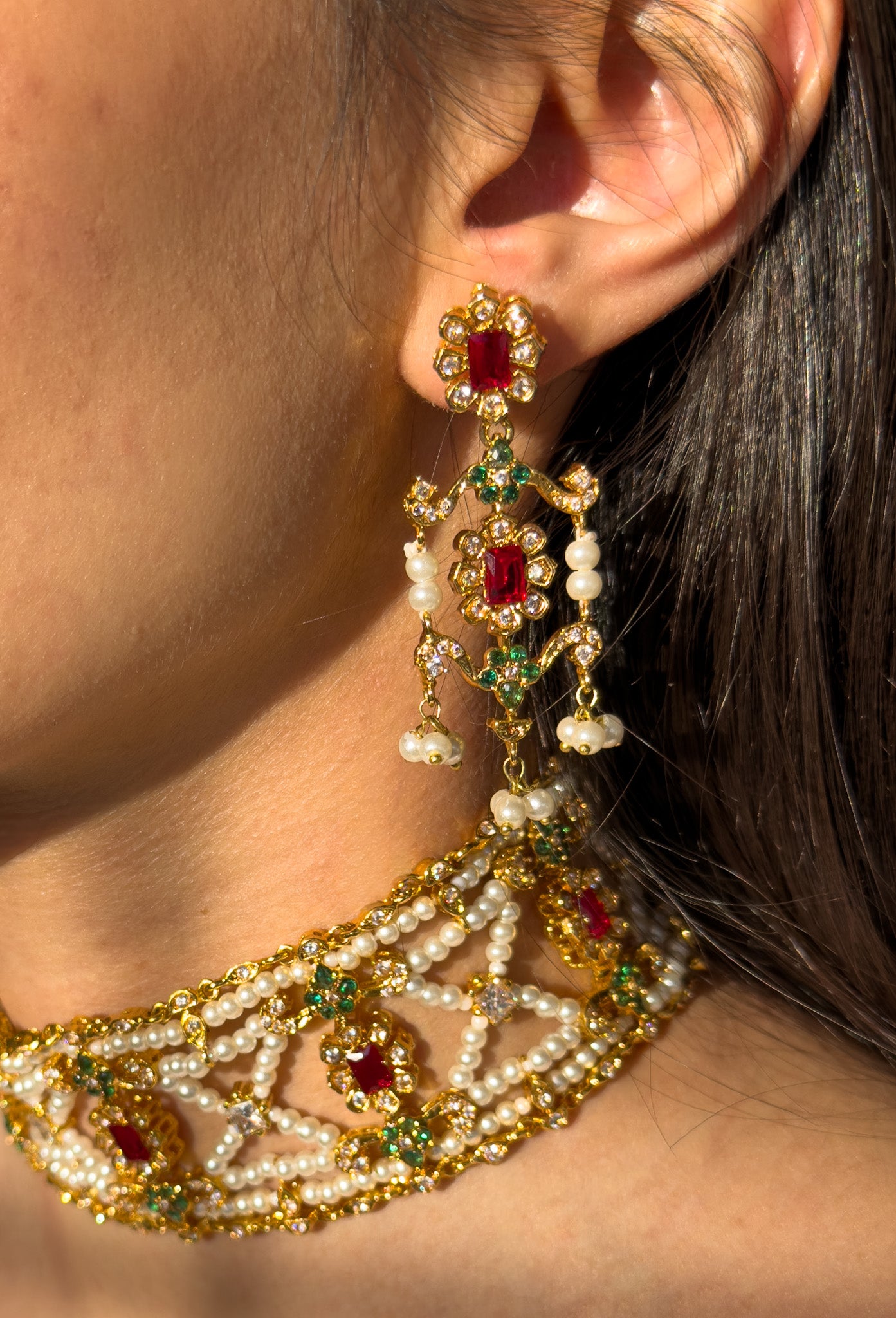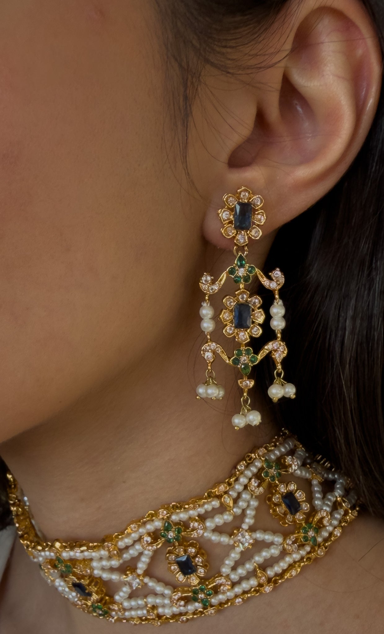 The Malka Set is a regal statement choker inspired by classic South Asian royal jewelry. Designed with intricate detailing, luminous faux pearls, and rich stones, this piece brings timeless elegance to bridal and festive looks. Paired with matching earrings, it creates a graceful and luxurious finish to any outfit.