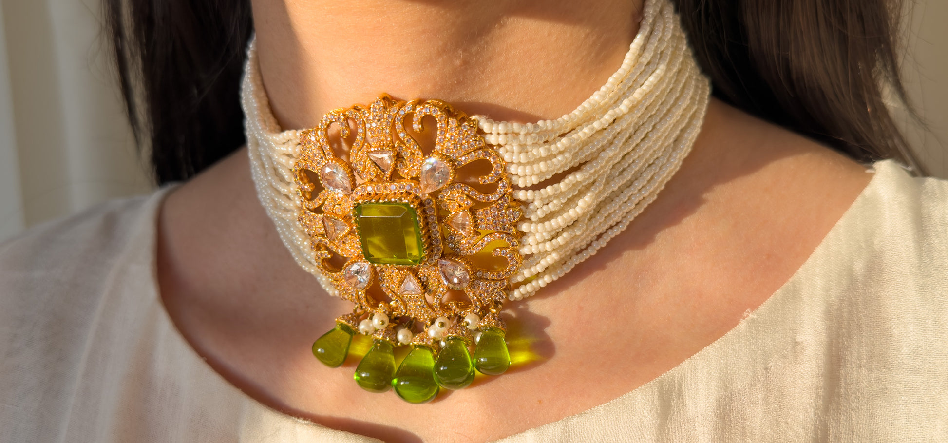 The Noor Set is an elegant pearl choker featuring layered strands of delicate pearls and a richly detailed gold centerpiece adorned with luminous stones and a radiant olive-green gem. Finished with matching statement earrings and green bead drops, this piece brings a regal yet timeless charm to bridal and festive looks.